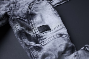 「CORDURA®︎」ブラックデニムをハードケミカルウォッシュにて極限までムラブリーチ。元のブラックを要所に残すために手作業にてピンを打ち、更にアクセントとしてブラックの吹きをプラス。特殊加工の風合いと確かな職人技が融合して生まれるスーパーライトグレーの逸品です。